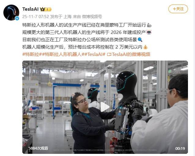 特斯拉称,目前也正在工厂及特斯拉办公场所测试各类使用场景,机器人规模化生产后,预计每台成本将控制在2万美元以内。