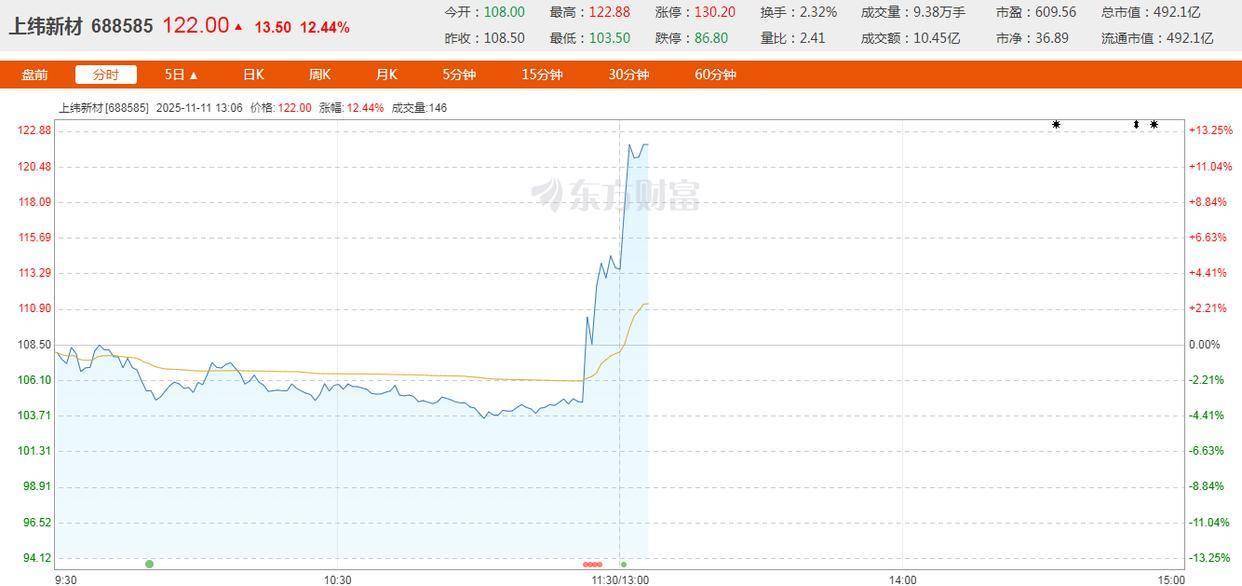 消息发出后,上纬新材今日开盘走跌的股价于午盘前快速反弹,截至午盘涨4.70%。下午开盘后再次走高,截至发稿涨12.44%上阳网,报122.0元/股。