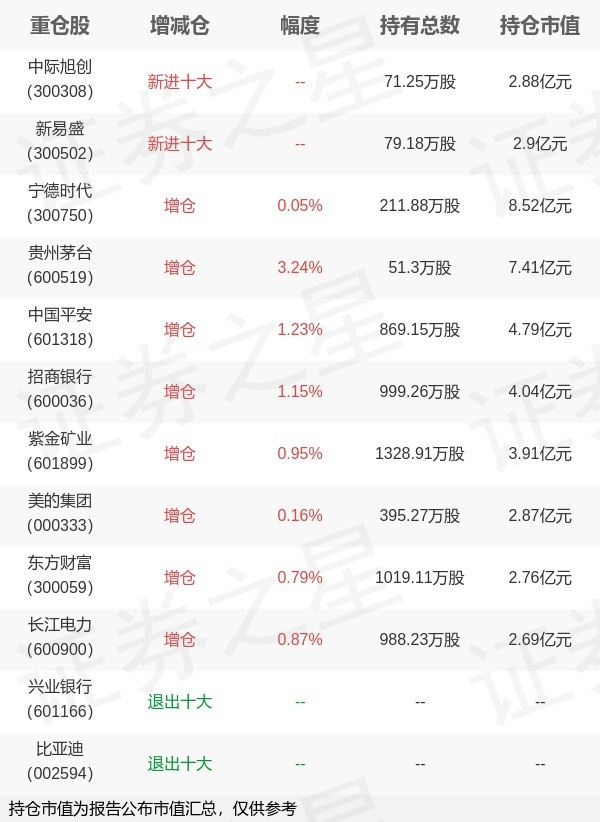 本站消息,10月28日国泰基金旗下黄岳管理的国泰中证A500交易型开放式指数基金公布三季报,近1年净值增长率24.04%。与上一季度相比,该基金前十大重仓股新增中际旭创,新易盛;并对宁德时代增仓0.11万股,为该基金第一大重仓股;兴业银行简配资,比亚迪等退出前十大重仓股;详细数据如下: